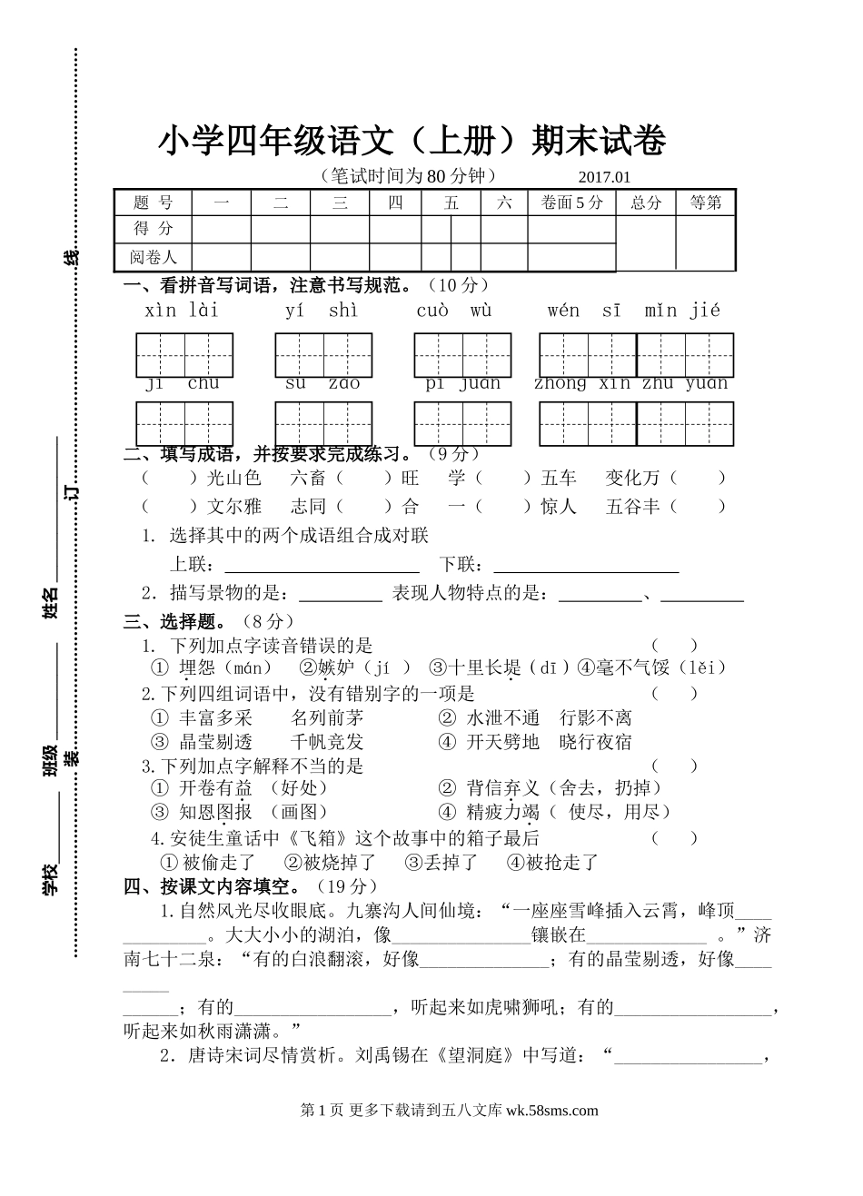 小学四年级语文(上册)期末试卷(笔试时间为80分钟)2017.01题号一二三四五六卷面5分总分等第得分阅卷人一、看拼音写词语,注意书写规范。(10分)xìnlàiyíshìcuòwùwénsīmǐnjiéjīchǔsùzàopíjuàn...