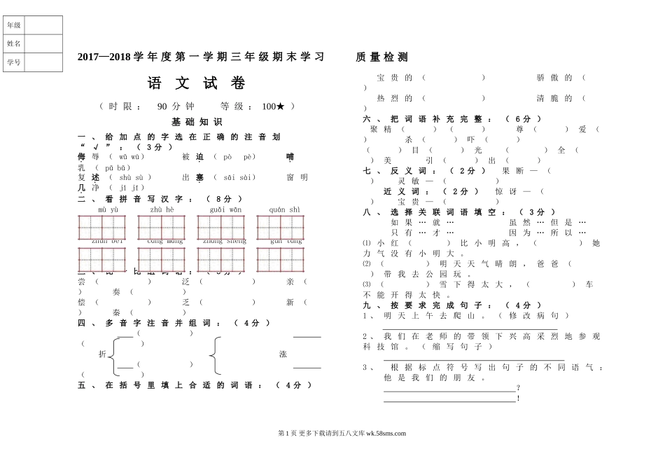 2017—2018学年度第一学期三年级期末学习质量检测语文试卷(时限:90分钟等级:100★)基础知识一、给加点的字选在正确的注音划“√”:(3分)侮辱(wǔwū)被迫(pòpè)哺乳(pǔbǔ)复述(shùsù)出塞(...