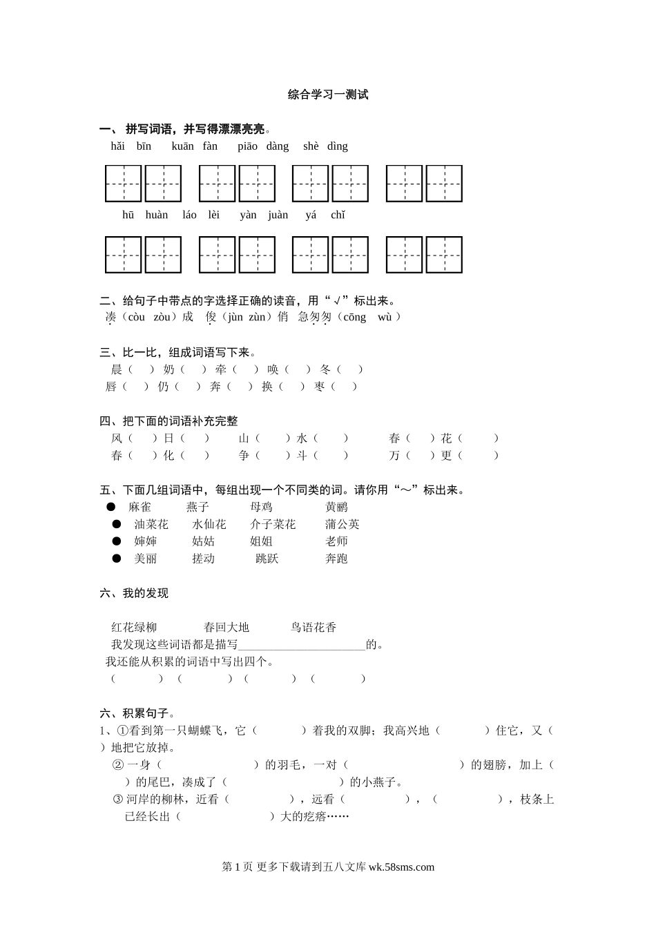 综合学习一测试一、拼写词语,并写得漂漂亮亮。hǎibīnkuānfànpiāodàngshèdìnghūhuànláolèiyànjuànyáchǐ二、给句子中带点的字选择正确的读音,用“√”标出来。凑(còuzòu)成俊(jùnzùn)俏...