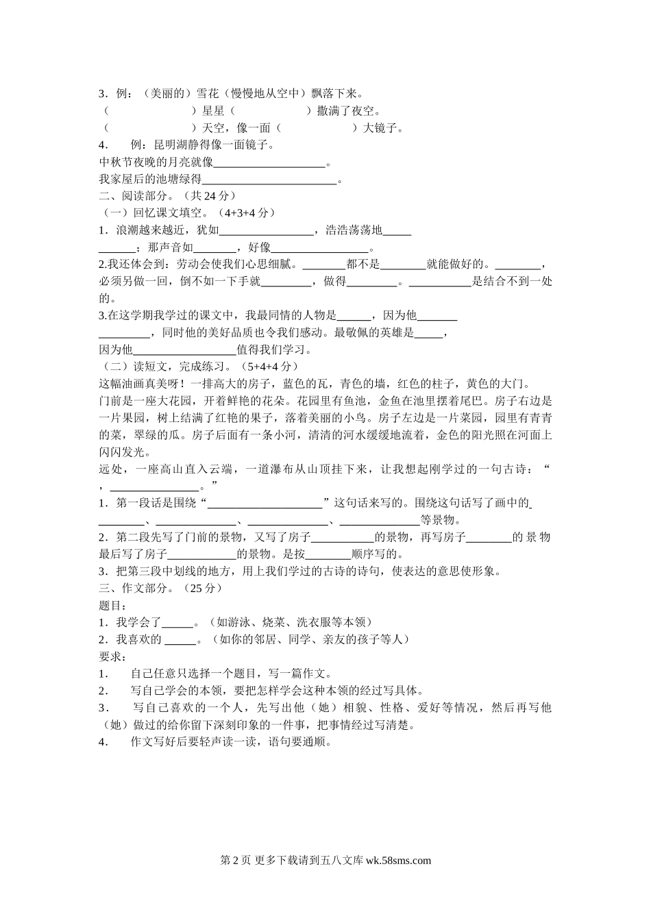 四年级语文期中检测试卷一、字词句部分。(共51分)(一)写字。(书写规范、工整)(4分)皂荚树的叶子结成了一顶巨大的绿色的帐篷。(二)读拼音写词语。(8分)hu‰f”xiƒnj”nji‘ch‚nlŠmŠngy‹nbŒxin...