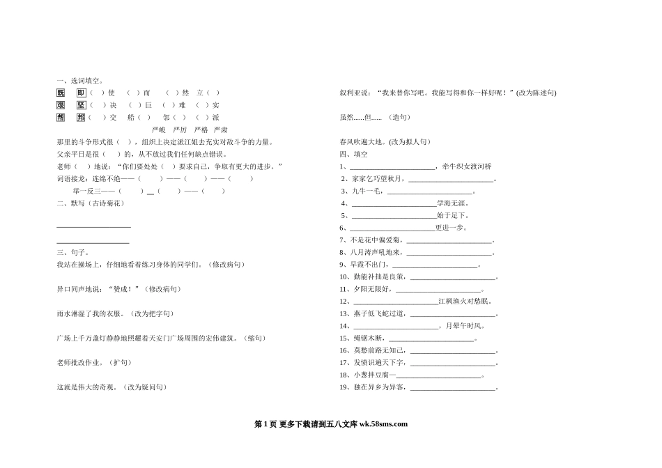 一、选词填空。既即()使()而()然立()艰坚()决()巨()难()实帮邦()交船()邻()()派严峻严厉严格严肃那里的斗争形式很(),组织上决定派江姐去充实对敌斗争的力量。父亲平日是很()的,从...