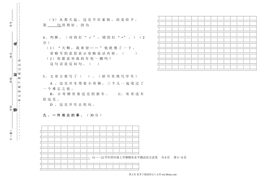 星月学校小学语文四年级上册期末试题.doc_第3页