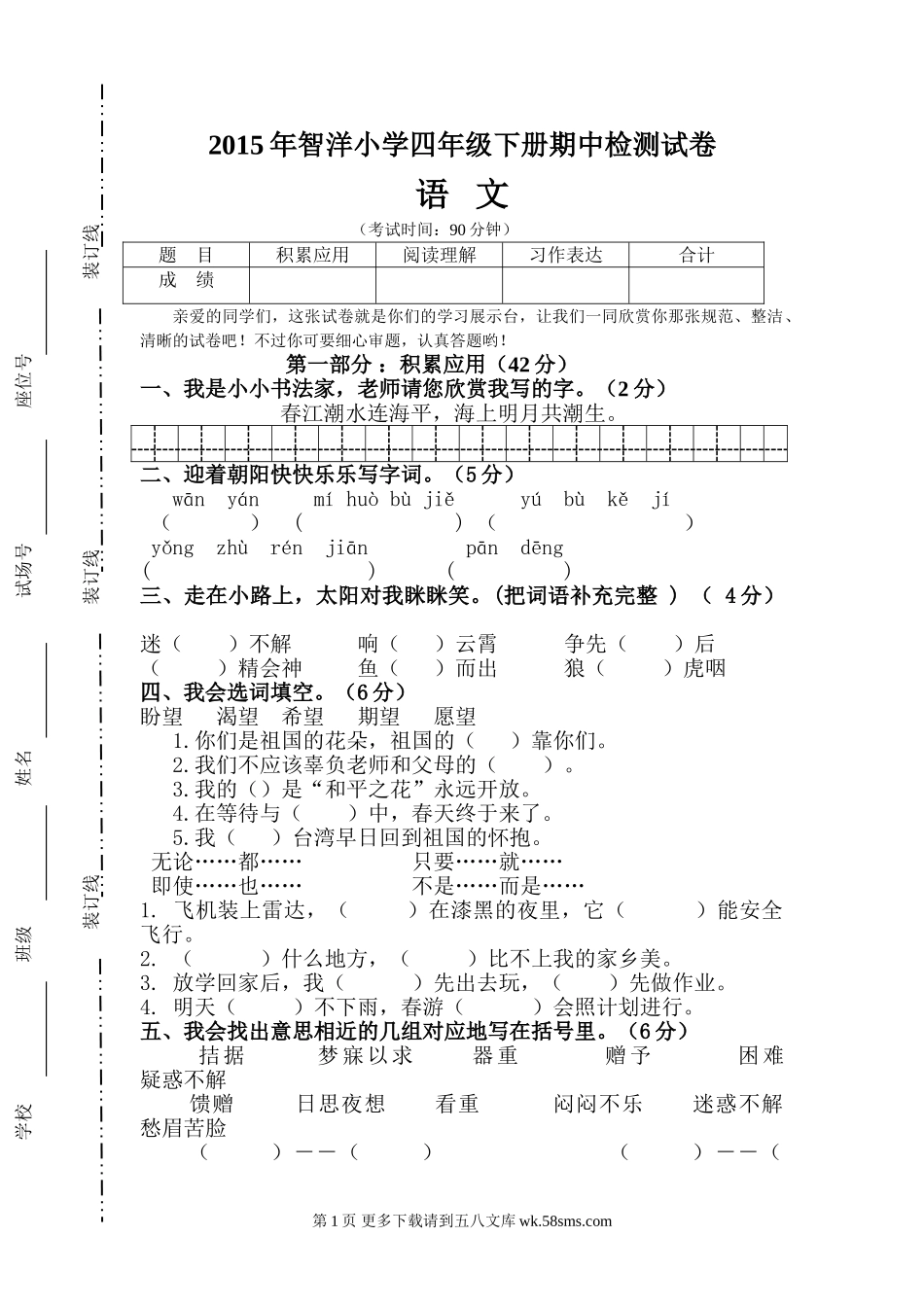 2015年智洋小学四年级下册期中检测试卷语文(考试时间:90分钟)题目积累应用阅读理解习作表达合计成绩亲爱的同学们,这张试卷就是你们的学习展示台,让我们一同欣赏你那张规范、整洁、清晰的试卷吧!不过你可要...