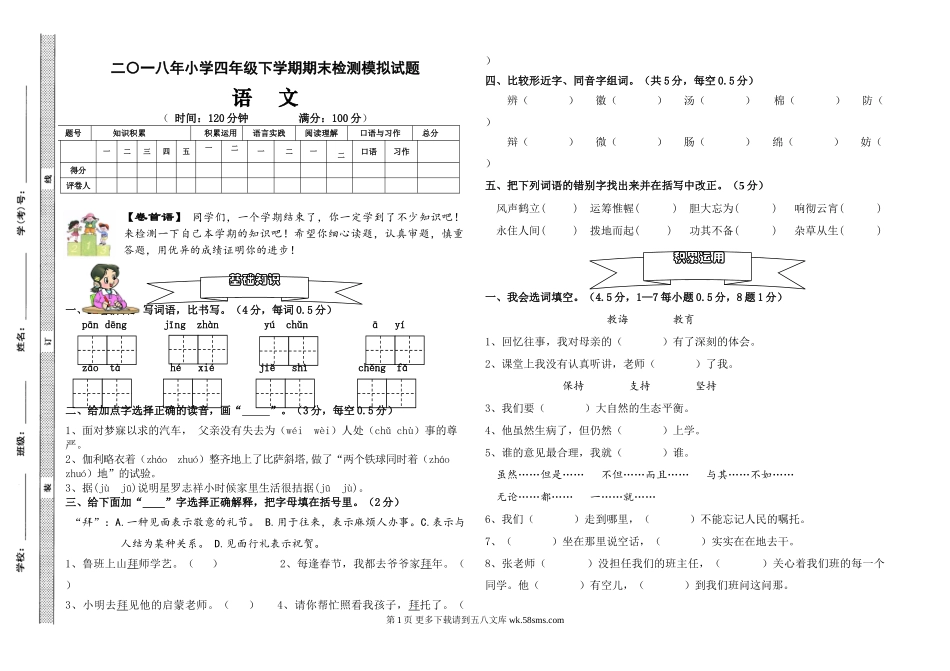 二〇一八年小学四年级下学期期末检测模拟试题语文(时间:120分钟满分:100分)题号知识积累积累运用语言实践阅读理解口语与习作总分一二三四五一二一二一二口语习作得分评卷人【卷首语】同学们,一个学期结束了...