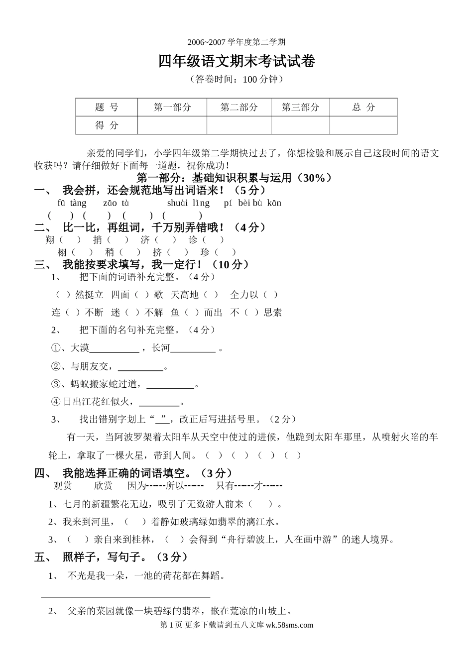 2006~2007学年度第二学期四年级语文期末考试试卷(答卷时间:100分钟)题号第一部分第二部分第三部分总分得分亲爱的同学们,小学四年级第二学期快过去了,你想检验和展示自己这段时间的语文收获吗?请仔细做好下...