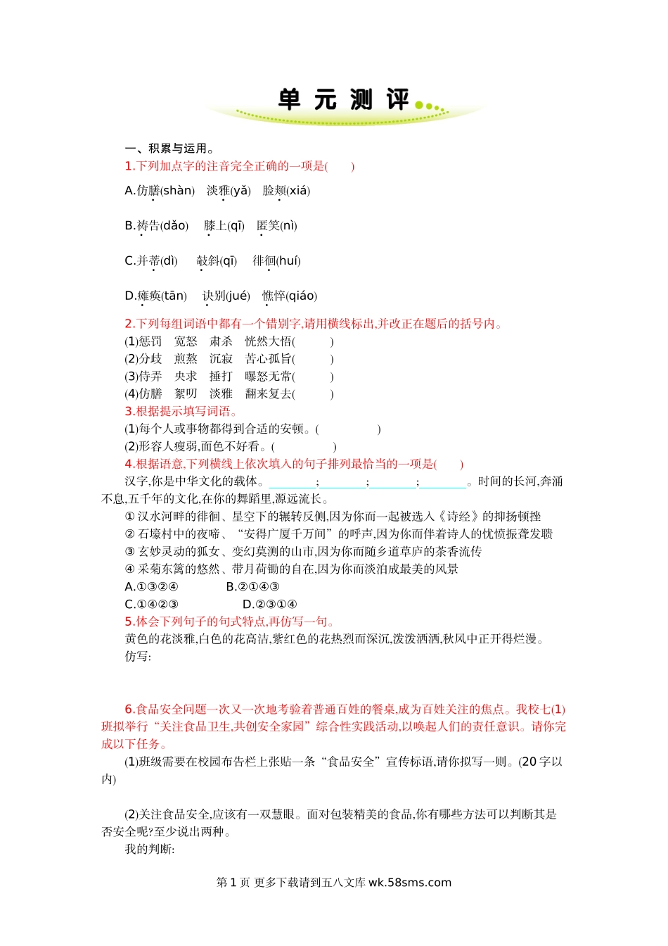 一、积累与运用。1.下列加点字的注音完全正确的一项是()A.仿膳(shàn)淡雅(yǎ)脸颊(xiá)B.祷告(dǎo)膝上(qī)匿笑(nì)C.并蒂(dì)攲斜(qī)徘徊(huí)D.瘫痪(tān)诀别(jué)憔悴(qiáo)2.下列每组词语中都有...