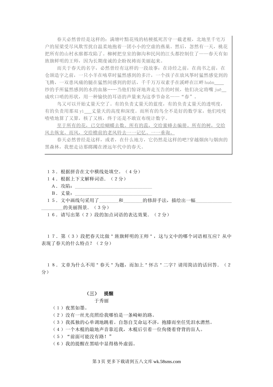 初一语文上册第三单元测试题五四制.doc_第3页