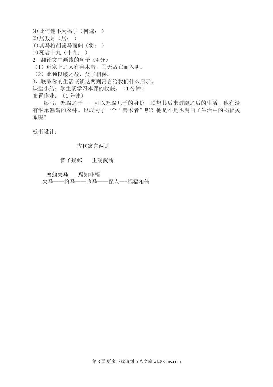 课题:古代寓言两则淄川实验中学张春华联系电话:13053377055第1页更多下载请到五八文库wk.58sms.com《古代寓言两则》学习目标:1、积累文言词语,学会翻译课文。2、加深对寓言的认识教学重点:理解积累文言词语...