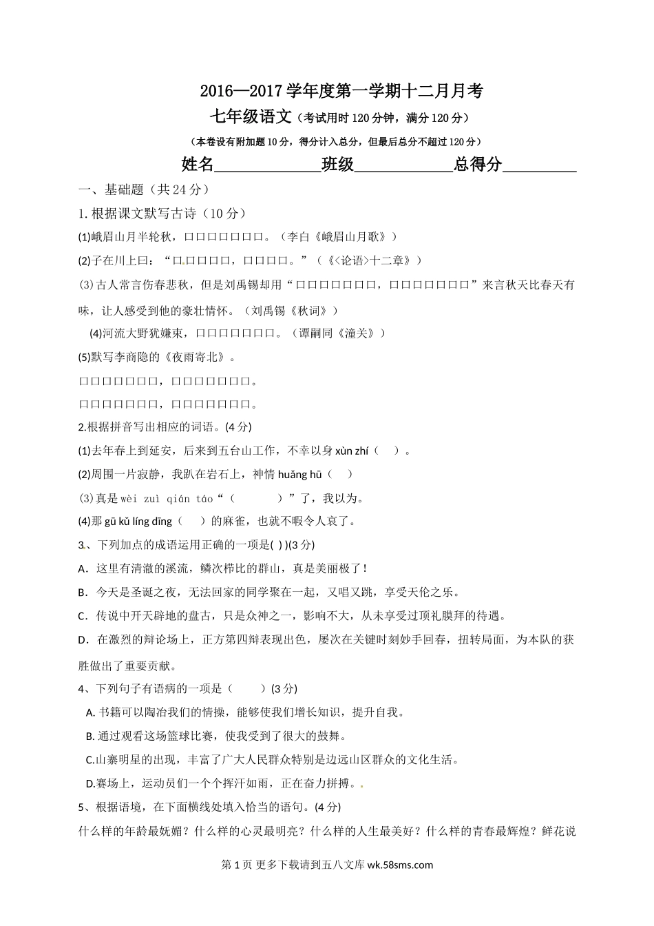 2016—2017学年度第一学期十二月月考七年级语文(考试用时120分钟,满分120分)(本卷设有附加题10分,得分计入总分,但最后总分不超过120分)姓名班级总得分一、基础题(共24分)1.根据课文默写古诗(10分)(1)...