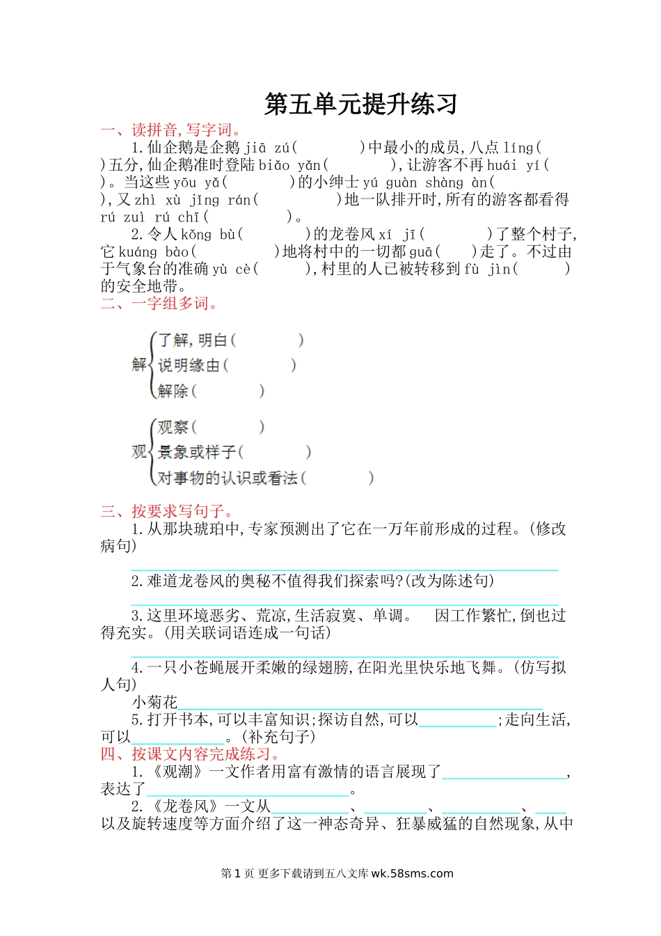 第五单元提升练习一、读拼音,写字词。1.仙企鹅是企鹅jiāzú()中最小的成员,八点línɡ()五分,仙企鹅准时登陆biǎoyǎn(),让游客不再huáiyí()。当这些yōuyǎ()的小绅士yúɡuànshànɡàn(),又zhìxùjǐnɡr...