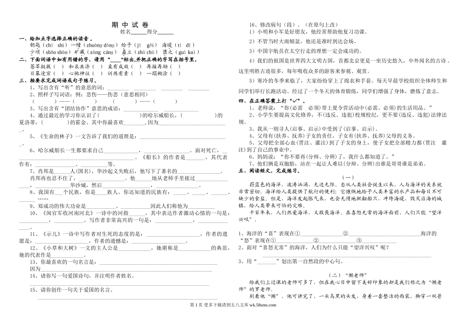 期中试卷姓名得分一、给加点字选择正确的读音。钥匙(chíshi)一幢(zhuànɡdònɡ)给予(jǐgěi)海堤(tídī)少顷(shǎoshào)矿藏(zàngcánɡ)矗立(zhùchù)匮乏(guìkuì)二、下面词语中如有...