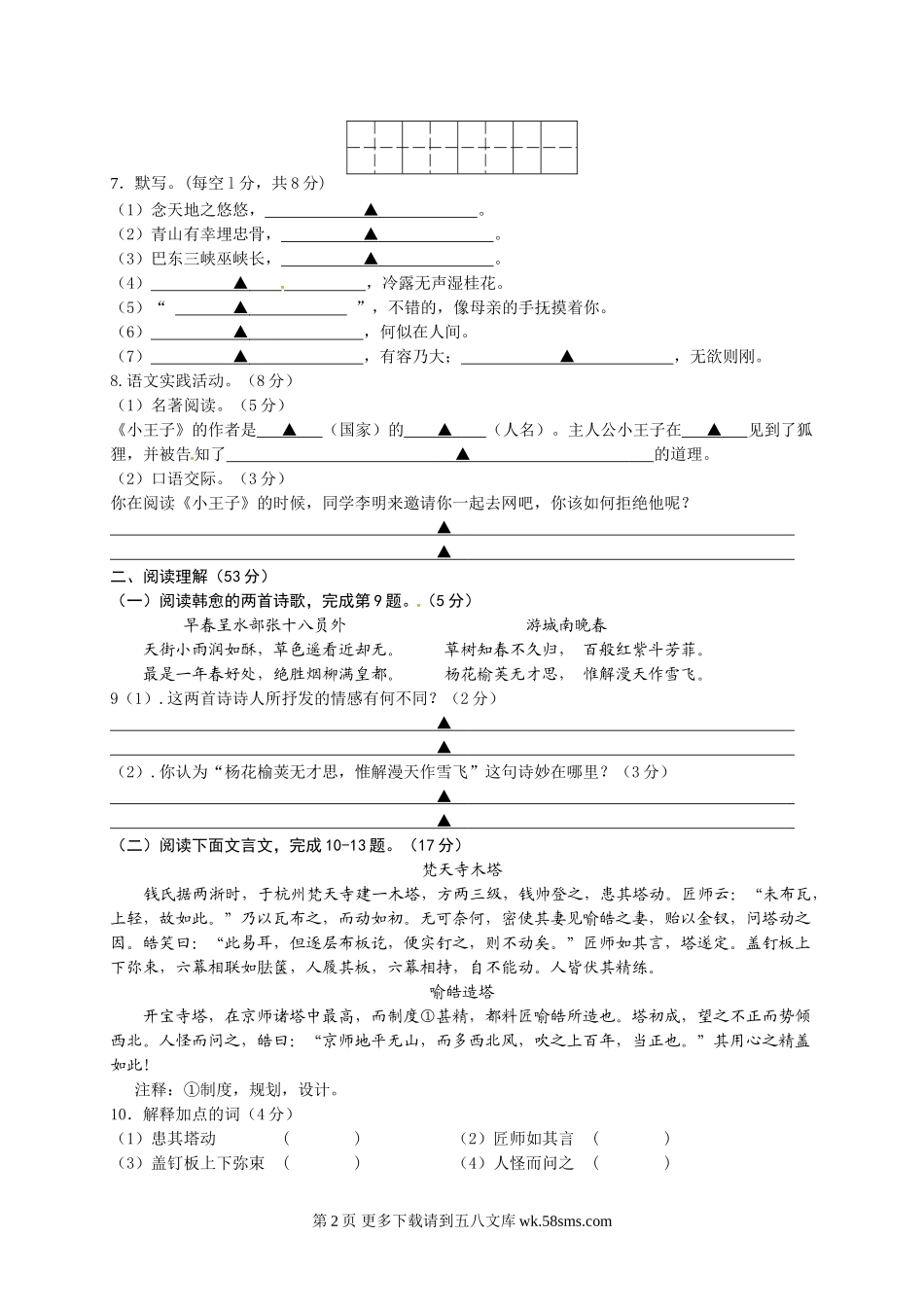 江都区实验初中2016年七年级语文12月月考试卷及答案.doc_第2页