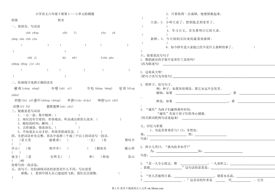 小学语文六年级下册第1——2单元检测题班级姓名一、看拼音,写词语chāyānɡzhélíyōuyǎyǎnɡzūnchǔyōu()()()()shūjíkūwěibiānpàozhānɡdēnɡjiécǎi()()()()二、给画线字选择...