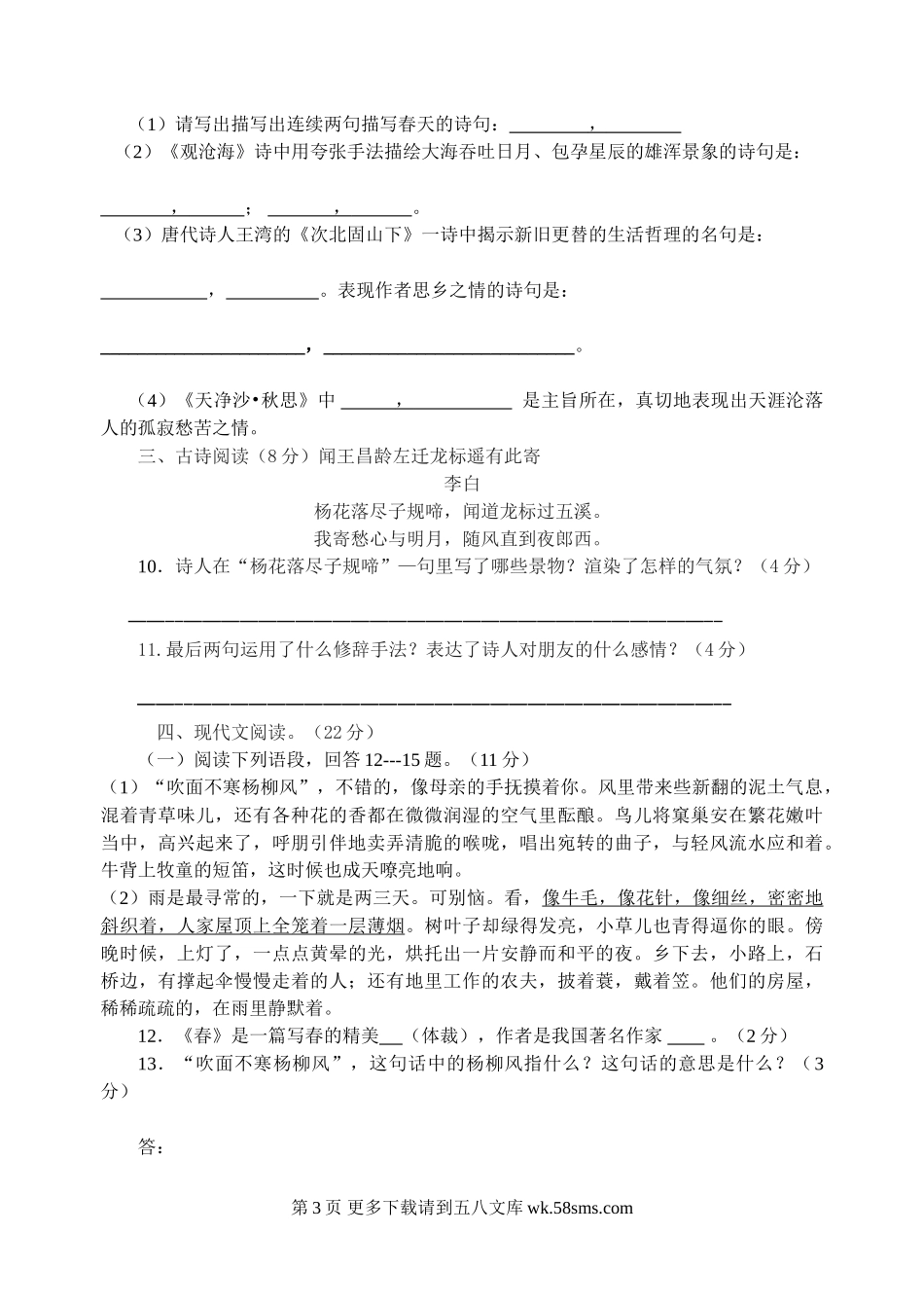 莒北八校2016--2017年七年级语文第一次月考试题及答案.doc_第3页