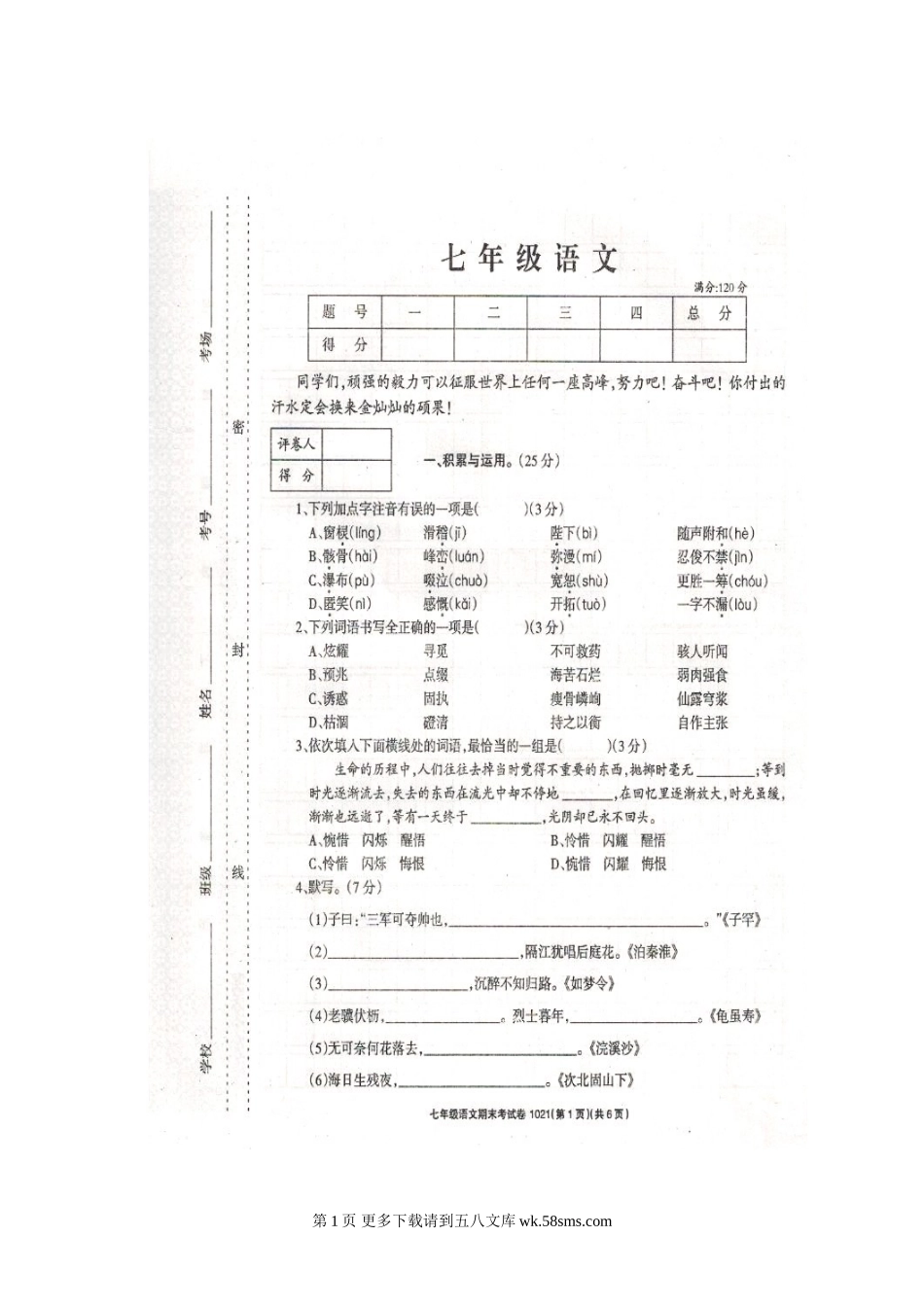 李埠口一中初一上学期期末语文考试卷及答案.doc_第3页