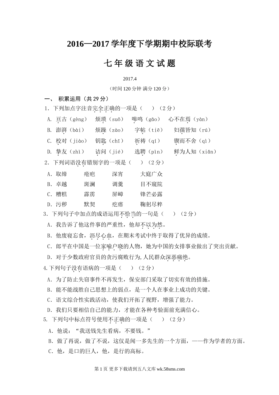 2016—2017学年度下学期期中校际联考七年级语文试题2017.4(时间120分钟满分120分)一、积累运用(共29分)1.下列加点字注音完全正确的一项是()(2分)A.亘古(gèng)烦琐(suǒ)嗥鸣(gāo)心不在焉(yàn...
