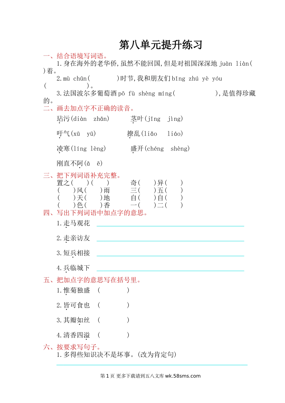 第八单元提升练习一、结合语境写词语。1.身在海外的老华侨,虽然不能回国,但是对祖国深深地juànliàn()着。2.mùchūn()时节,我和朋友们bǐngzhúyèyóu()。3.法国波尔多葡萄酒pōfùshèngmíng(),是值得珍藏的...