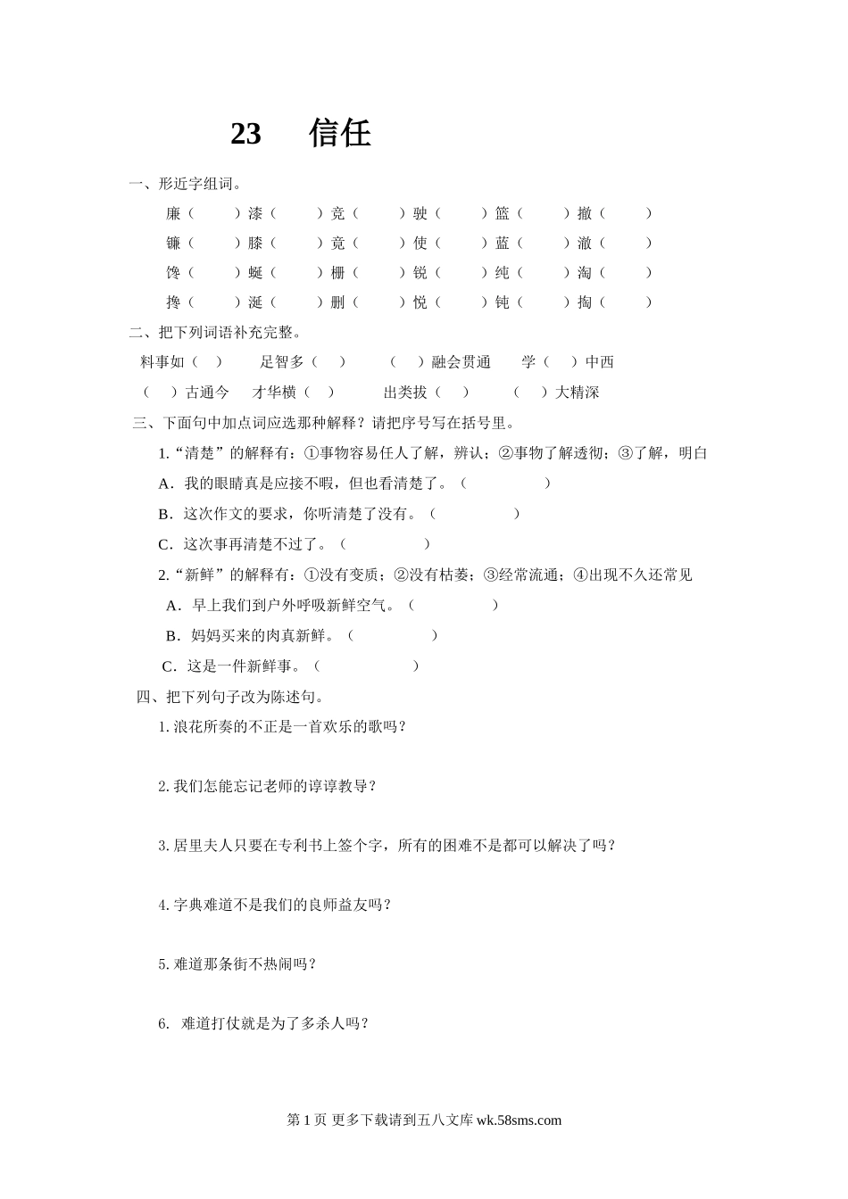 23信任一、形近字组词。廉()漆()竞()驶()篮()撤()镰()膝()竟()使()蓝()澈()馋()蜒()栅()锐()纯()淘()搀()涎()删()悦()钝()掏()二、把下列词语补充完整。料事如...
