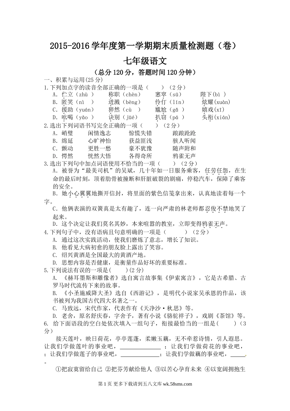 2015-2016学年度第一学期期末质量检测题(卷)七年级语文(总分120分,答题时间120分钟)一、积累与运用(25分)1.下列加点字的读音全部正确的一项是()(2分)A.伫立(zhù)称职(chèn)窸窣(sū)陛下(bì)B...