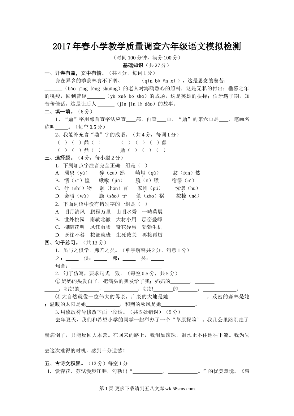 2017年春小学教学质量调查六年级语文模拟检测(时间100分钟,满分100分)基础知识(共27分)一、开卷有益,文中有情。(共4分,每词1分)身在异乡的季羡林食不下咽、(qǐnbùānxí),这是思念的愁苦;(bǎoj...