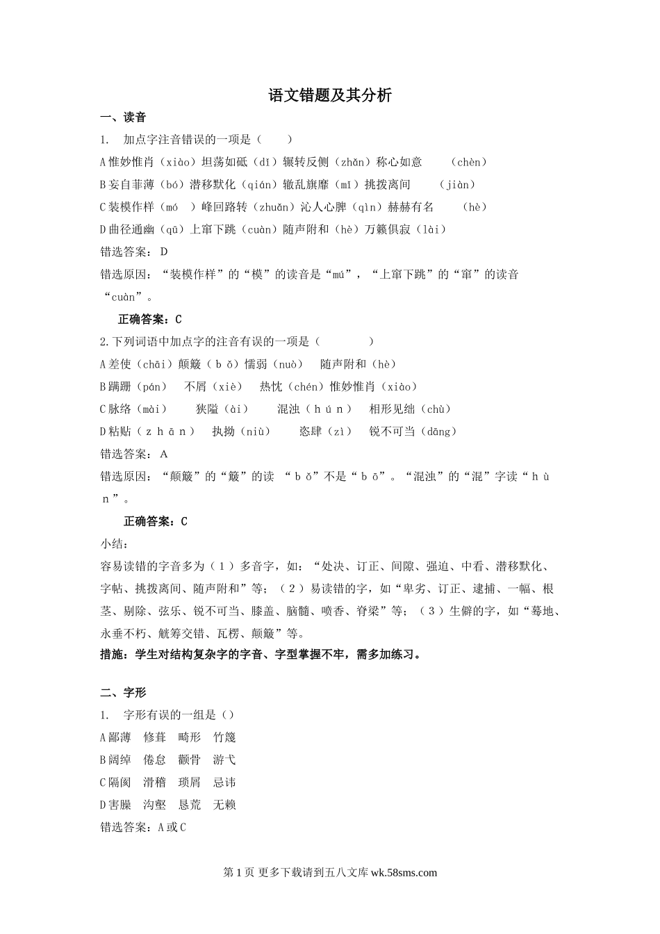 语文错题及其分析一、读音1.加点字注音错误的一项是()A惟妙惟肖(xiào)坦荡如砥(dǐ)辗转反侧(zhǎn)称心如意(chèn)B妄自菲薄(bó)潜移默化(qián)辙乱旗靡(mǐ)挑拨离间(jiàn)C装模作样(m...