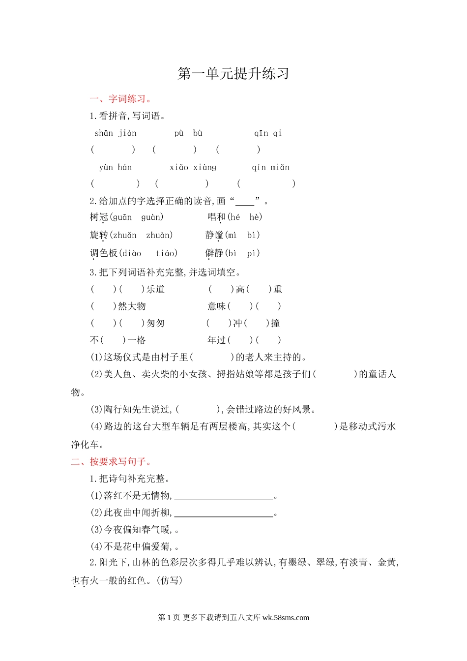 第一单元提升练习一、字词练习。1.看拼音,写词语。shānjiànpùbùqīnqi()()()yùnhánxiǎoxiànɡqínmiǎn()()()2.给加点的字选择正确的读音,画“”。树冠(ɡuānɡuàn)唱和(héhè)旋转(zhuǎnzhuàn)静谧...