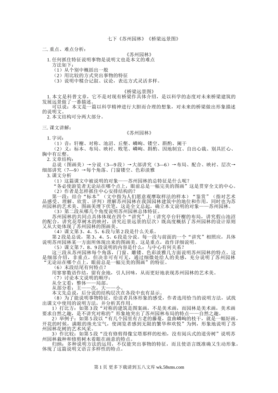 七下《苏州园林》《桥梁远景图》二.重点、难点分析:《苏州园林》1.任何抓住特征说明事物是说明文也是本文的难点方法如下:(1)从个别中概括出一般(2)用比较的方式突出事物的特征(3)说明中糅合记叙、议论,...