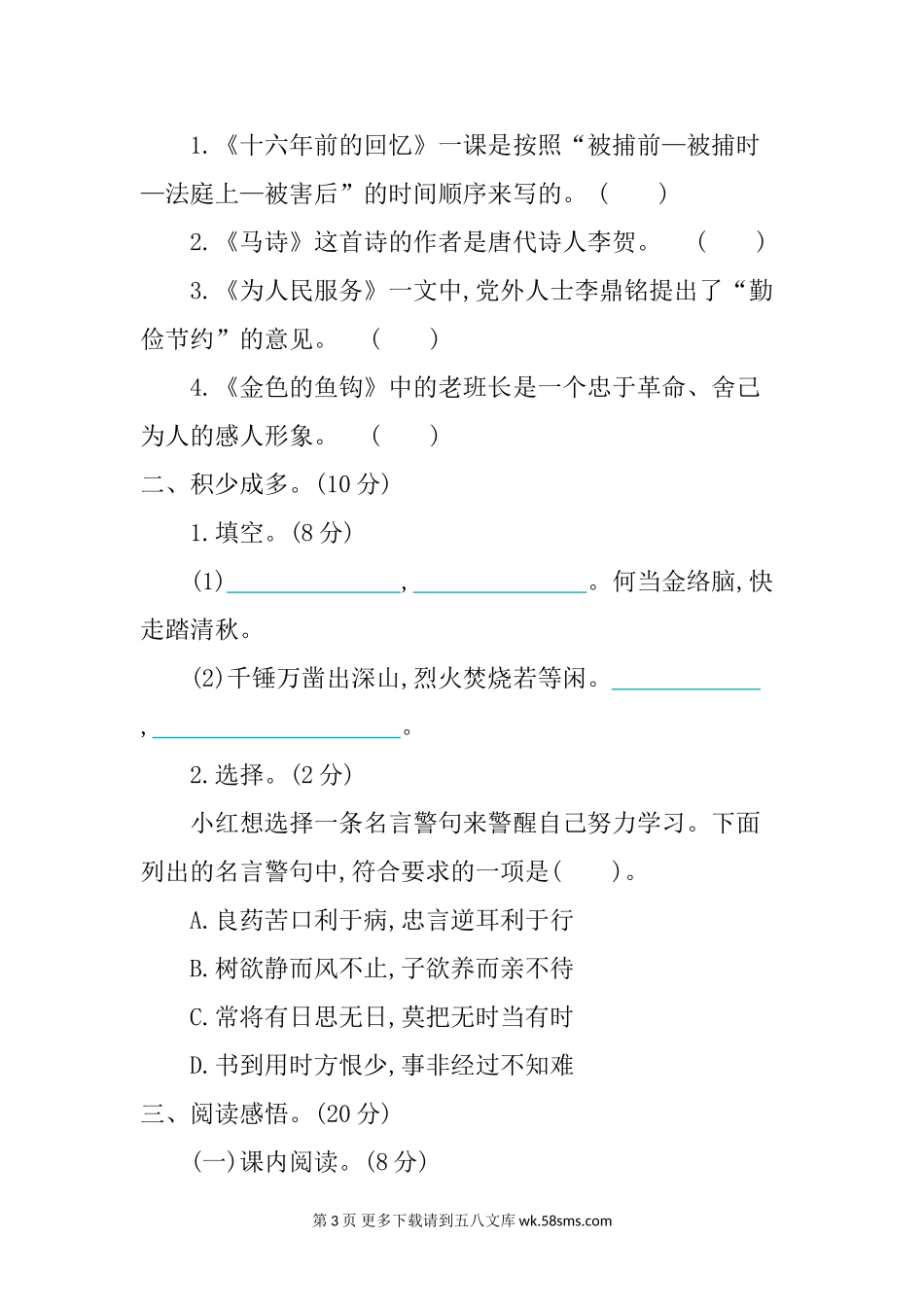 2020-2021学年六年级语文下册第四单元测试题及答案.doc_第3页