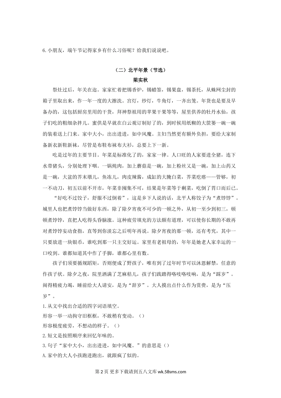 专题五六年级下册课外阅读专项练习一、百里不同风,千里不同俗(一)边城(节选)沈从文边城所在一年中最热闹的日子,是端午,中秋和过年。三个节日过去三五十年前如何兴(xīngxìng)奋了这地方人,直到现在,...
