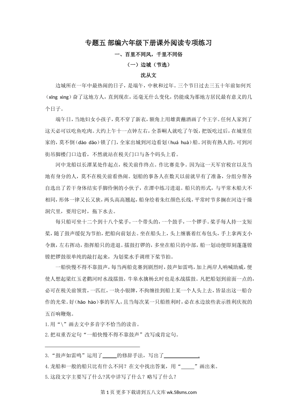 专题五部编六年级下册课外阅读专项练习一、百里不同风,千里不同俗(一)边城(节选)沈从文边城所在一年中最热闹的日子,是端午,中秋和过年。三个节日过去三五十年前如何兴(xīngxìng)奋了这地方人,直到现...
