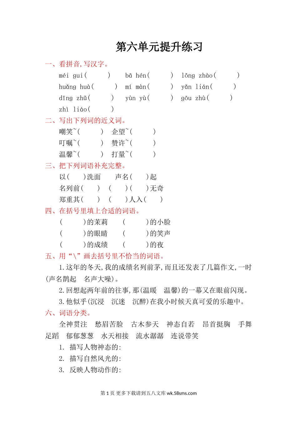 第六单元提升练习一、看拼音,写汉字。méiɡui()bāhén()lǒnɡzhào()huǎnɡhuà()mímàn()yǎnlián()dīnɡzhǔ()yùnyù()ɡōuzhù()zhìliáo()二、写出下列词的近义词。嘲笑~()企望~()叮嘱~()赞许~()温...