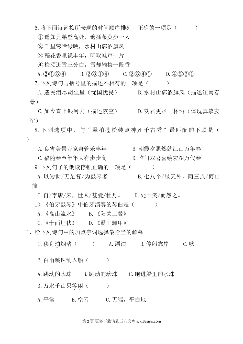 古诗专项一、我会选。1.下列加点字读音、含义完全相同的一项是()A.路转溪桥忽见风吹草地见牛羊B.还来就菊花明月何时照我还C.明月别枝惊鹊萋萋满别情D.日暮客愁新客舍青青柳色新2.下列各句中“若”字的意思与其...