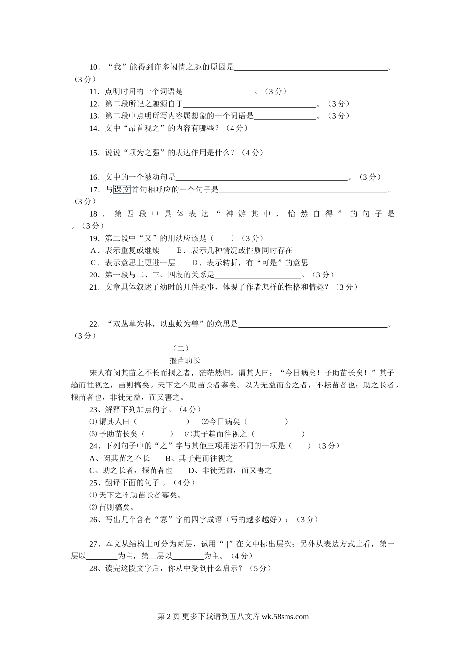 《童趣》第一部分:基础知识1.本文选自,作者是代文学家。(3分)2.给加点字注音并解释:(5分)⑴昂首观之,项为之强。()()⑵果如鹤唳云端,怡然称快。()()⑶神游其中,怡然自得。()()⑷以土砾凸...