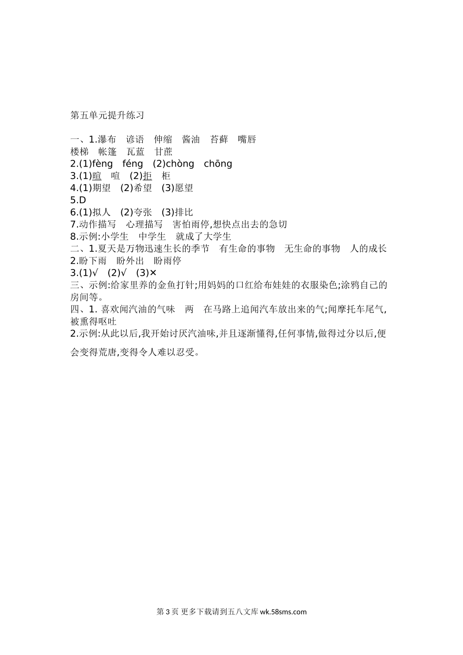 第五单元提升练习一、基础知识。1.读拼音,写词语。pùbùyànyǔshēnsuōjiàngyóutáixiǎn()()()()()zuǐchúnlóutīzhàngpengwǎlángānzhe()()()()()2.给句中加点字选择正确的读音,画“√”。(1)我从门...