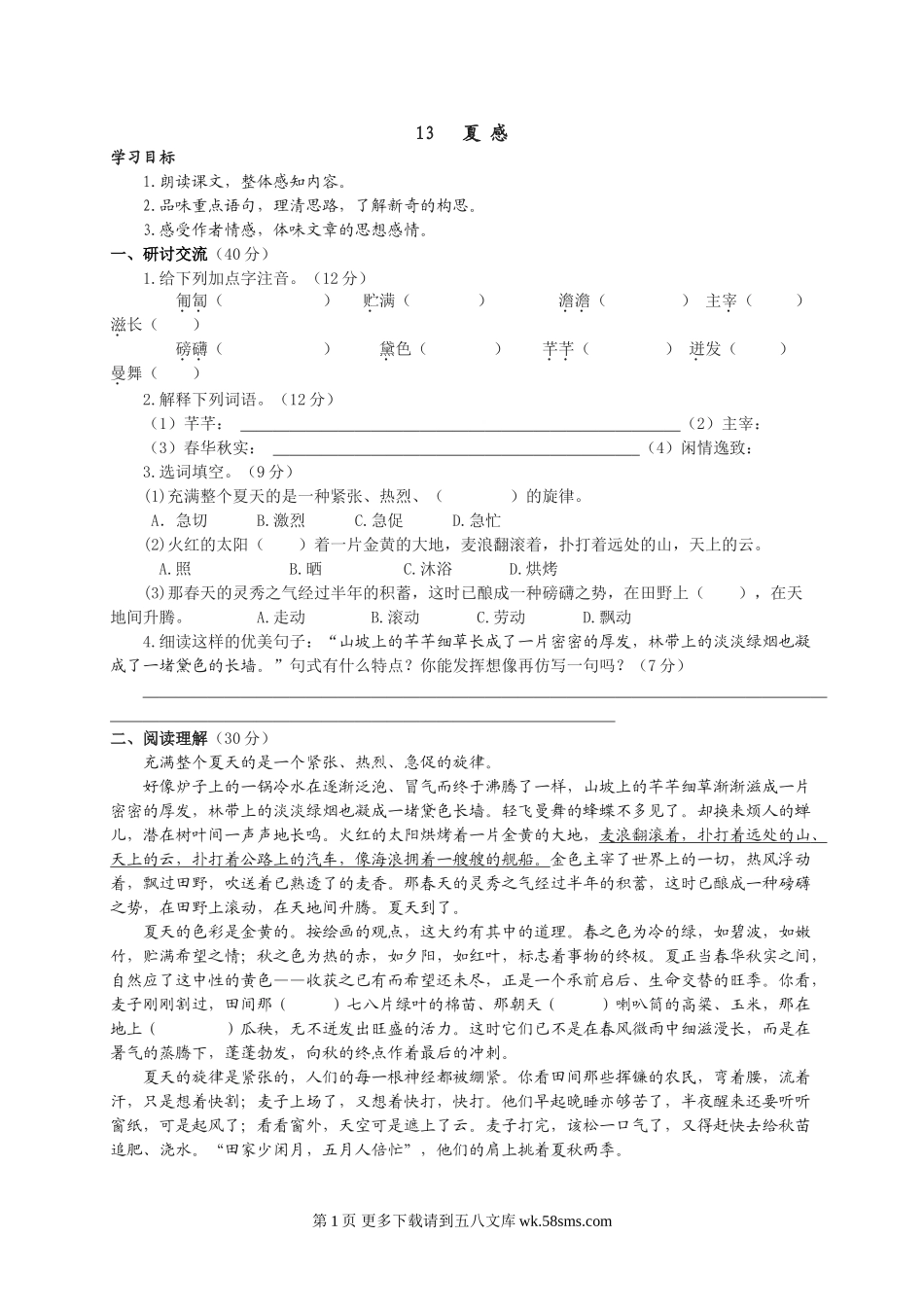 13夏感学习目标1.朗读课文,整体感知内容。2.品味重点语句,理清思路,了解新奇的构思。3.感受作者情感,体味文章的思想感情。一、研讨交流(40分)1.给下列加点字注音。(12分)匍匐()贮满()澹澹()主宰(...