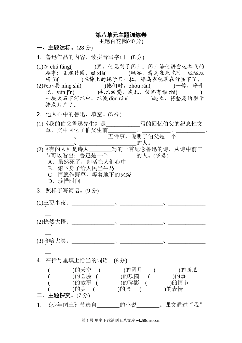 第八单元主题训练卷主题百花园(40分)一、主题达标。(28分)1.鲁迅作品的内容,读拼音写字词。(8分)(1)在chúfáng()里,他见到了闰土。闰土给他讲雪地捕鸟的趣事:支起竹匾,sǎxià()秕谷,看鸟雀来吃时,远远地...