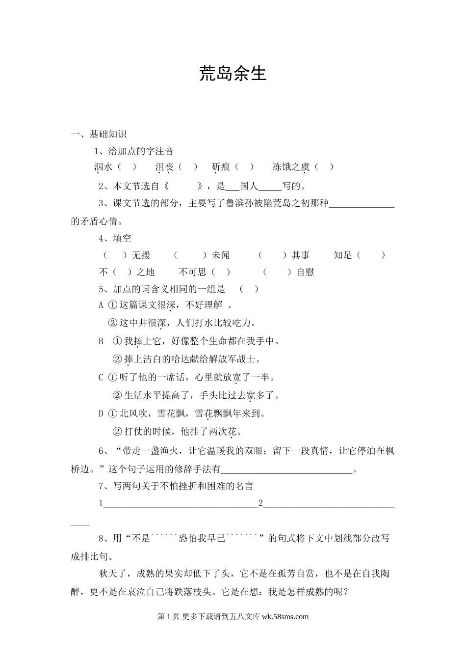荒岛余生一、基础知识1、给加点的字注音泅水()沮丧()斫痕()冻饿之虞()2、本文节选自《》,是国人写的。3、课文节选的部分,主要写了鲁滨孙被陷荒岛之初那种的矛盾心情。4、填空()无援()未闻()其事...