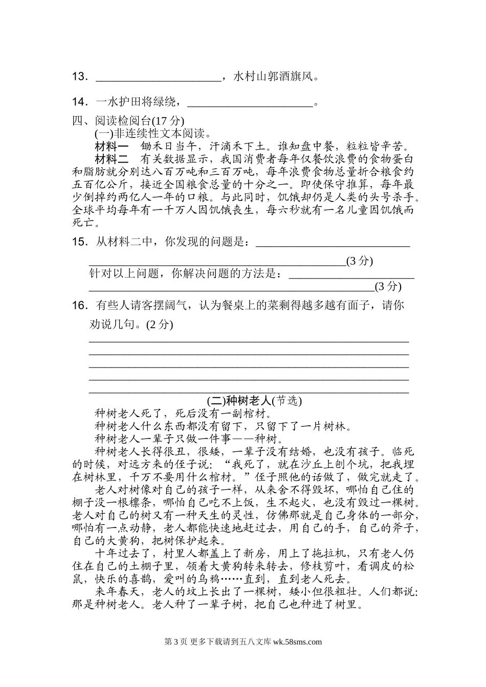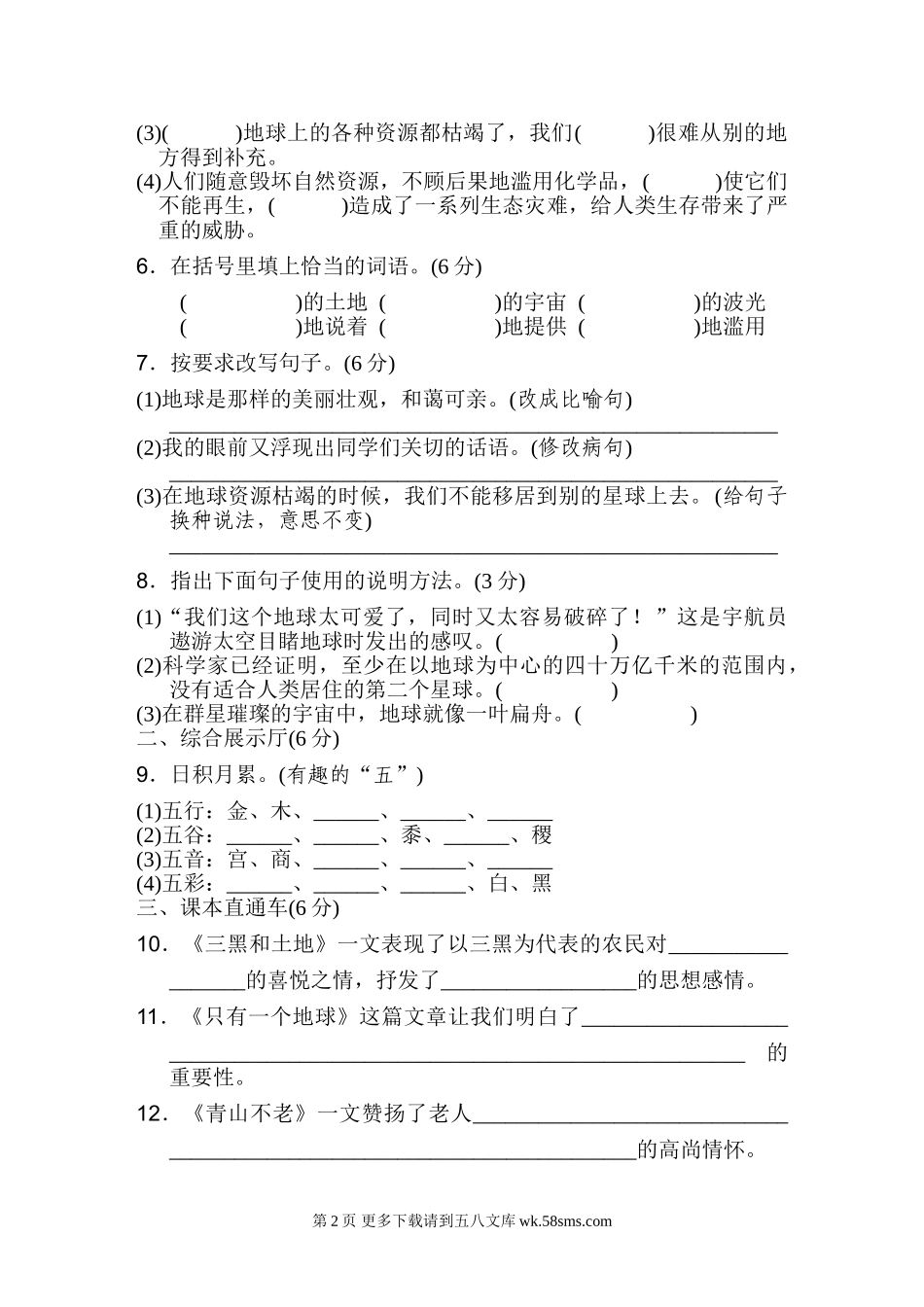 第六单元达标检测卷时间:90分钟满分:100分一、基础训练营(46分)1.看拼音,写词语。(8分)2.下面加点的字读音完全正确的一组是(),不正确的用“——”画出并改正在后面的括号里。(4分)A.肆虐(niè)荞(qiáo)麦...