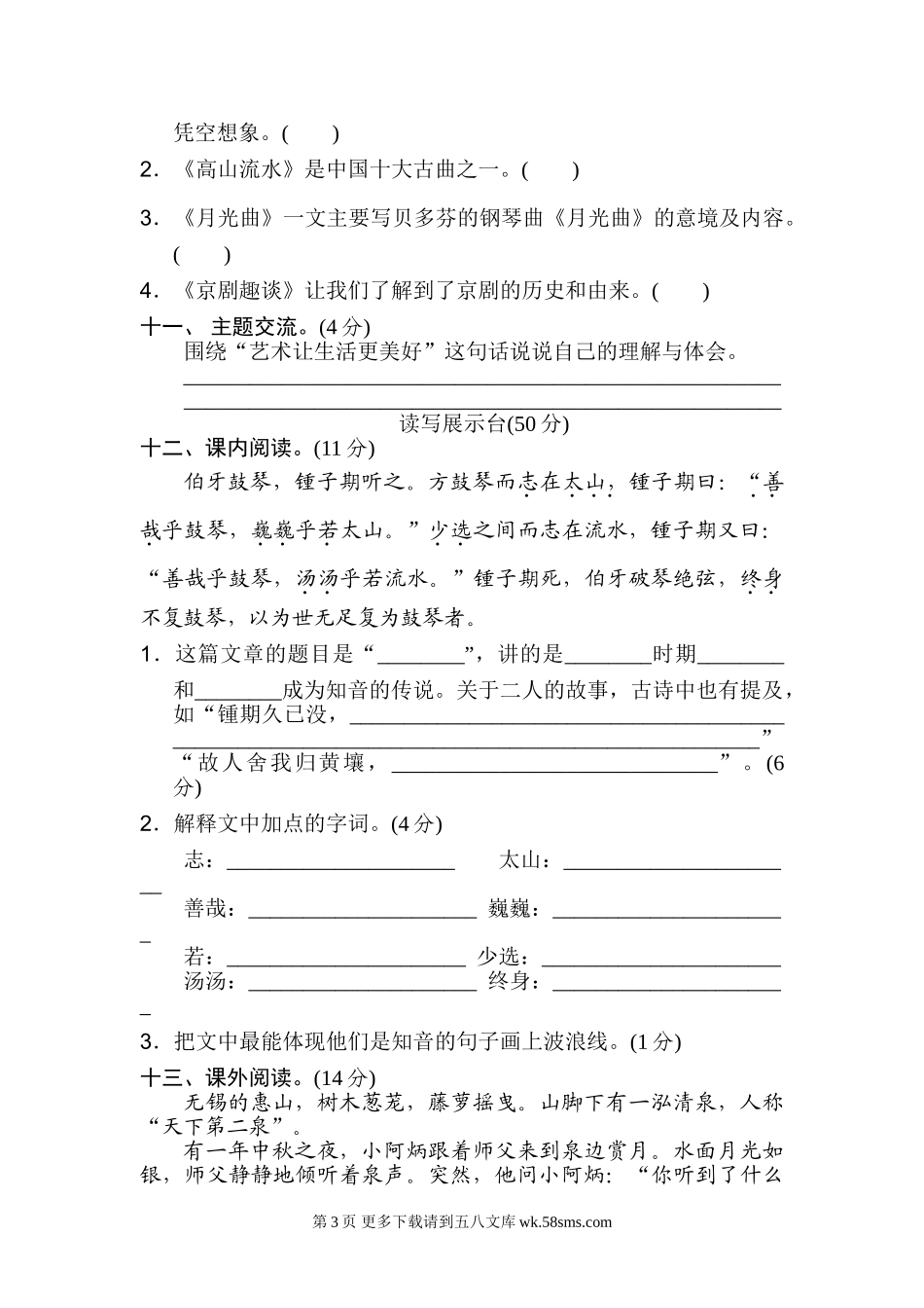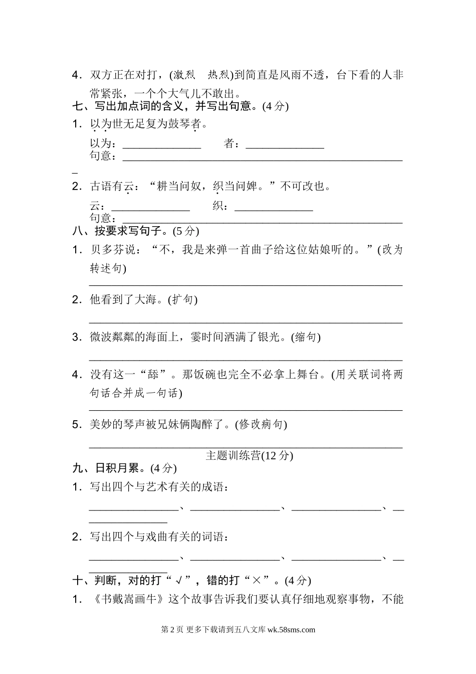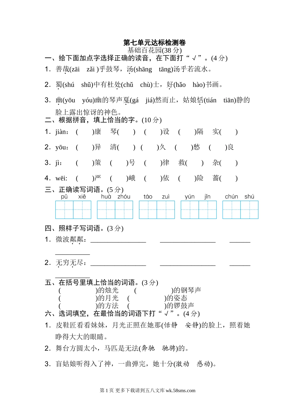 第七单元达标检测卷基础百花园(38分)一、给下面加点字选择正确的读音,在下面打“√”。(4分)1.善哉(zāizǎi)乎鼓琴,汤(shāngtāng)汤乎若流水。2.蜀(shúshǔ)中有杜处(chǔchù)士,好(hǎohào)书画。3....