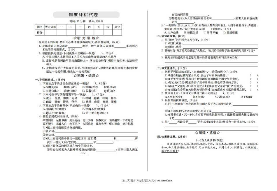 第1页更多下载请到五八文库wk.58sms.com听力训练听力材料第2页更多下载请到五八文库wk.58sms.com皮影戏(节选)“皮影”是对皮影戏和皮影戏人物(包括场面、道具、景物)制品的通用称谓。中国皮影艺术是我国民间工艺...
