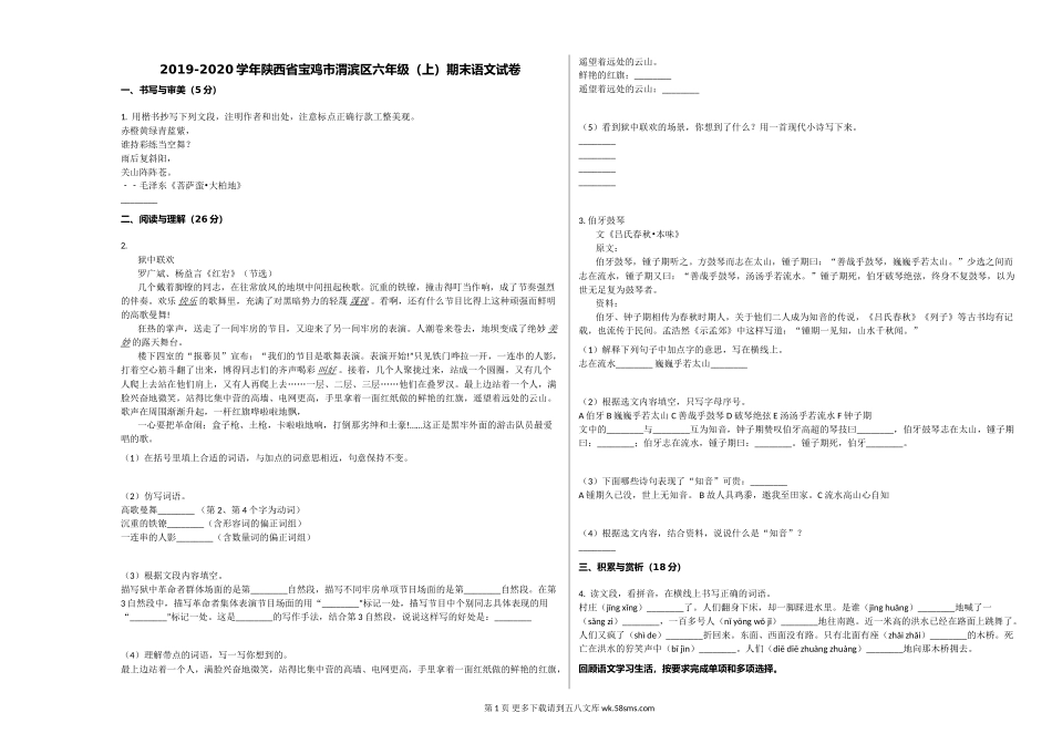 2019-2020学年陕西省宝鸡市渭滨区六年级(上)期末语文试卷一、书写与审美(5分)1.用楷书抄写下列文段,注明作者和出处,注意标点正确行款工整美观。赤橙黄绿青蓝紫,谁持彩练当空舞?雨后复斜阳,关山阵阵苍。...