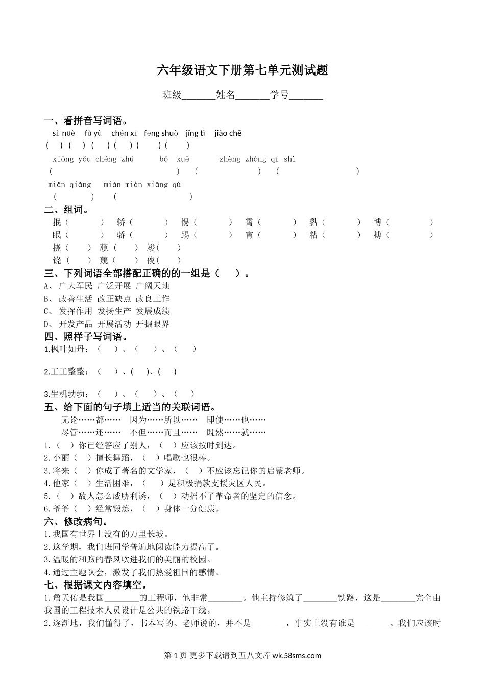 六年级语文下册第七单元测试题班级_______姓名_______学号_______一、看拼音写词语。sìnüèfùyùchénxīfēngshuòjǐngtìjiàochē()()()()()()xiōngyǒuchéngzhúbōxuēzhèngzhòngqíshì()()()miǎn...