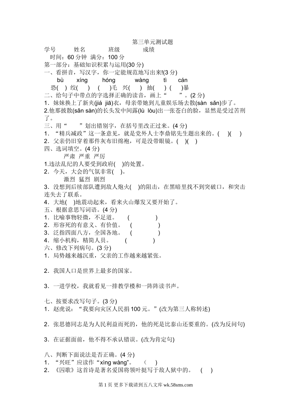 第三单元测试题学号姓名班级成绩时间:60分钟满分:100分第一部分:基础知识积累与运用(30分)一、看拼音,写汉字,你一定能规范地写出来!(3分)bùxínghóngwàngtìcán恐()绞()()毛兴()抽()()暴二、给句子中带...