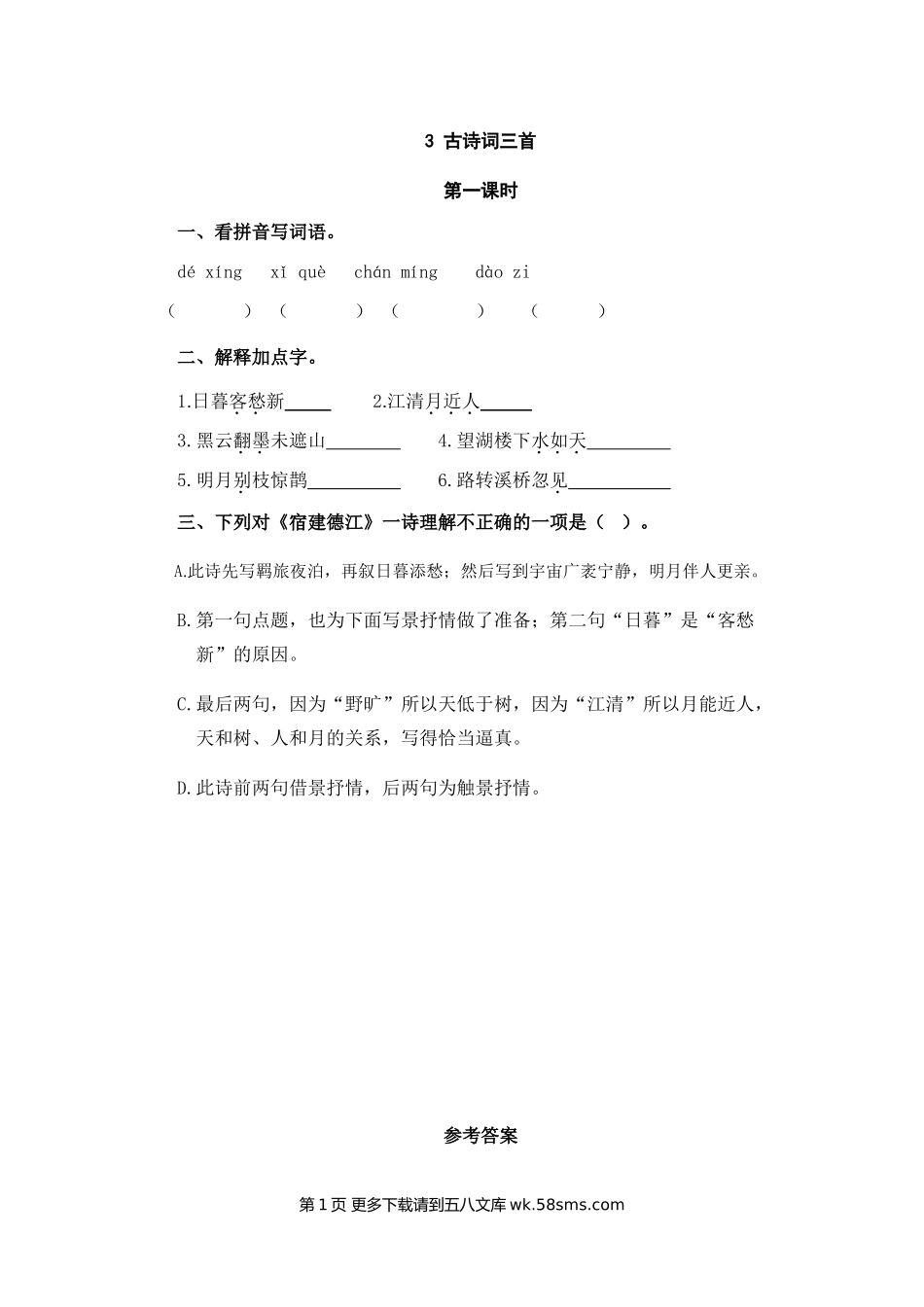 3古诗词三首第一课时一、看拼音写词语。déxíngxǐquèchánmíngdàozi()()()()二、解释加点字。1.日暮客愁新2.江清月近人3.黑云翻墨未遮山4.望湖楼下水如天5.明月别枝惊鹊6.路转溪桥忽见三、下列对《...