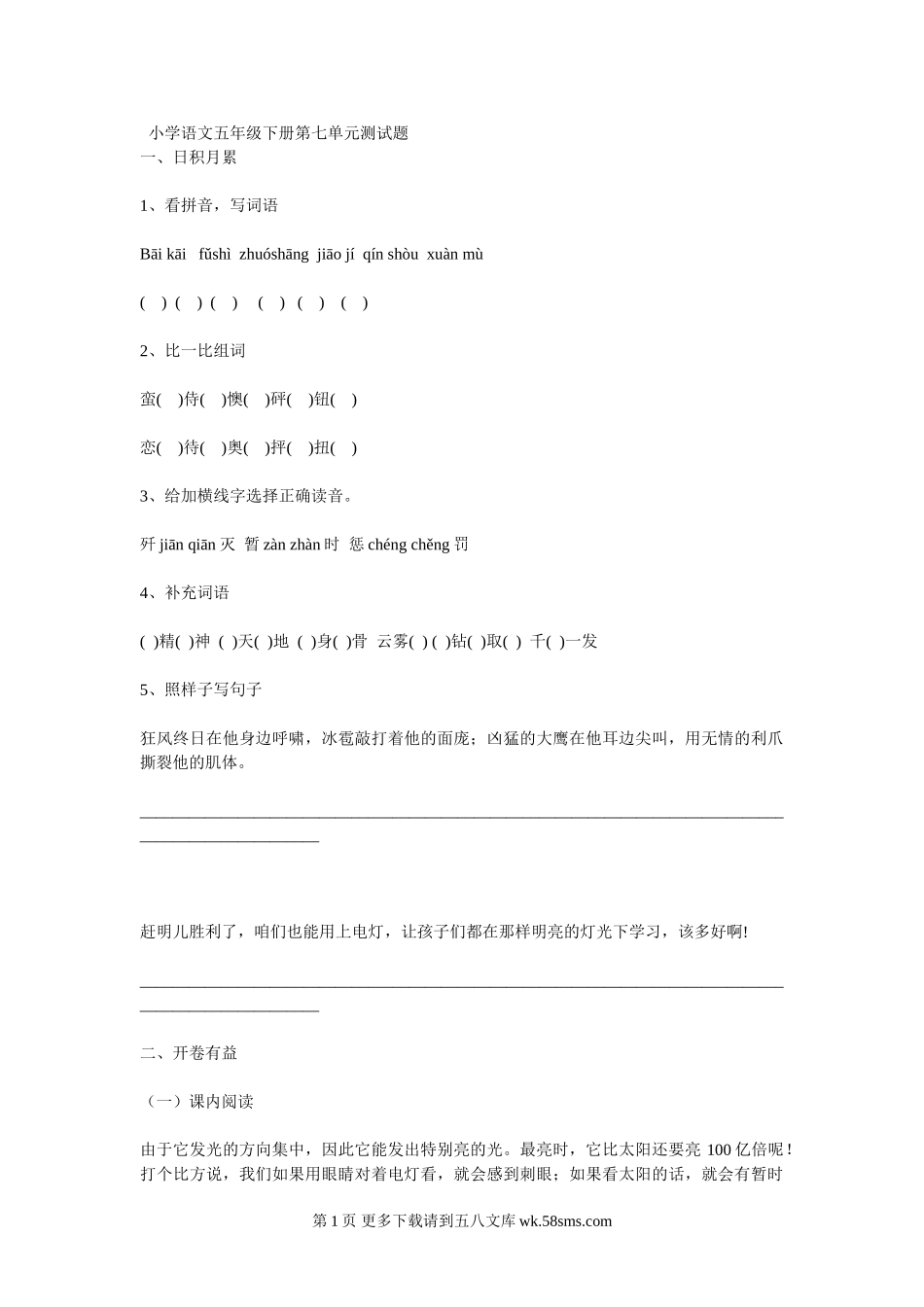 北师大版小学五年级语文下册第七单元测试题.doc_第1页
