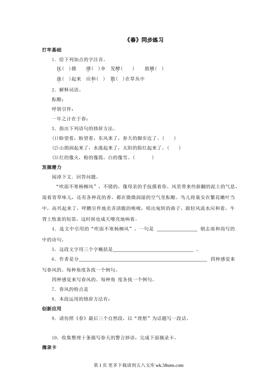 《春》同步练习打牢基础1.给下列加点的字注音。抚()摸撑()伞发酵()胳膊()涨()起来应和()散()在草丛中2.解释词语。酝酿:呼朋引伴:一年之计在于春:3.指出下列语句的修辞方法。(1)盼望着,盼望着,东风来了,...