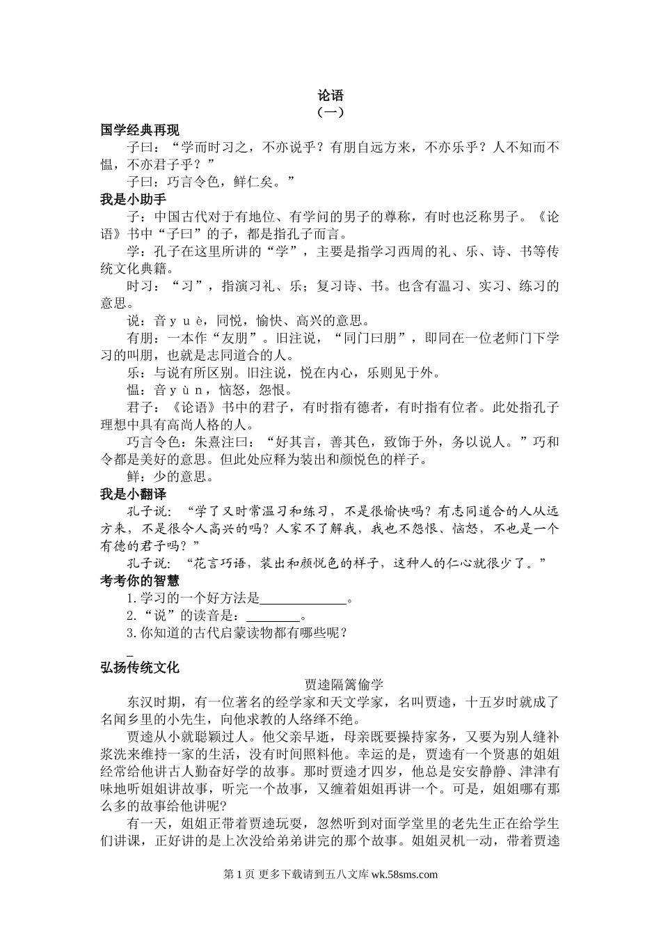 部编版五年级上册《论语》《孟子》国学阅读题及答案.doc_第1页