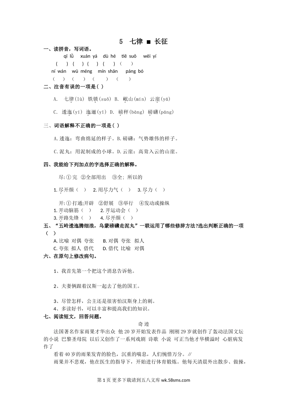 5七律长征▪一、读拼音,写词语。qīlǜxuányádùhétiěsuǒwēiyí()()()()()níwánwūméngmínshānpángbó()()()()二、注音有误的一项是()A.七律(lù)铁锁(suǒ)B.岷山(mín)云崖(yá)C.逶迤(...