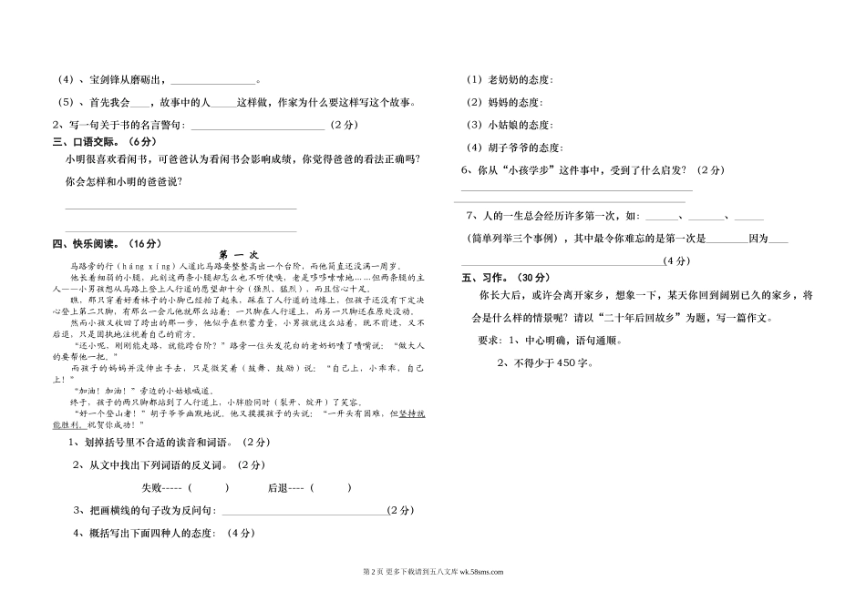 道县小太阳学校下期五年级语文期中考试检测试题.doc_第2页