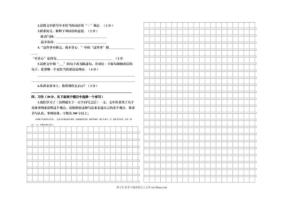 凤冈县第二学期六年级语文试卷(三)【人教版】.doc_第3页